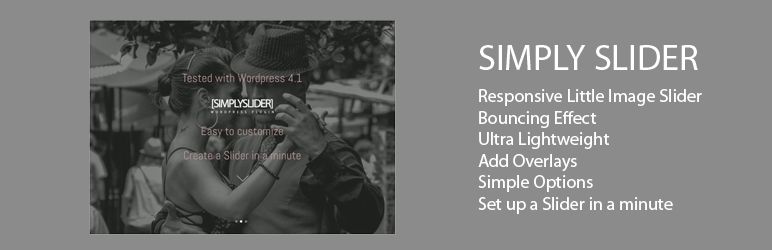 Simply Slider Simply Slider provides simple and easy to use engine for uploading and managing slides of images, with the ability to add images, add different overlays for each image, change color for each slide, add text and headline or logo file.. in the past