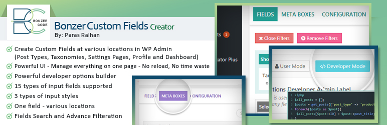 Bonzer Custom Fields Creator Custom Fields Creator is created to enable developers to create array of input fields at various locations inside the wordpress admin panel.. in the past