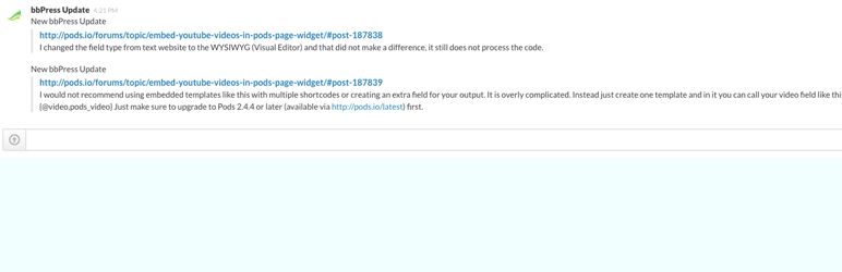 bbPress Slack Integration Created for Pods bbPress support forums, this plugin sends notification into your Slack channel of choice whenever new topic or is created bbPress... in the past